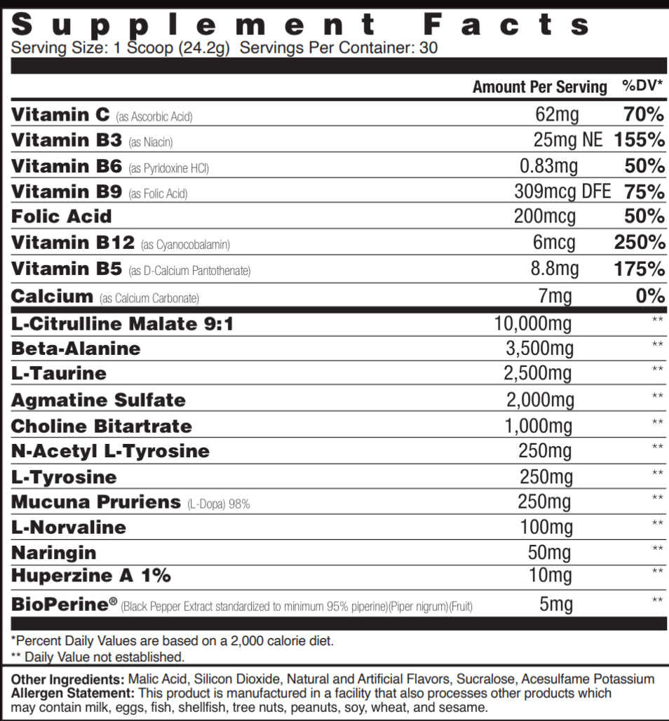 Increased Vascularity/Nitric Oxide Citrulline Malate 9:1– 10 grams per scoop!