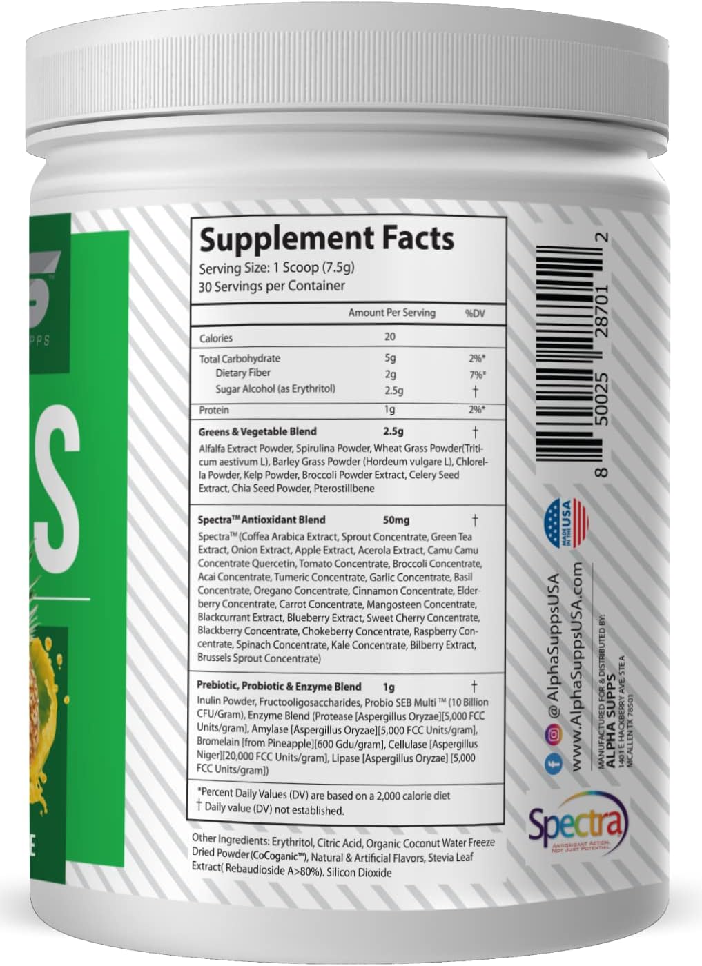 Alpha Supps® Greens has over 40 plant-based ingredients as well as Spectra™, prebiotic fiber, digestive enzymes, and Probiferrin® probiotics to support total body wellness and an healthier, active lifestyle.*