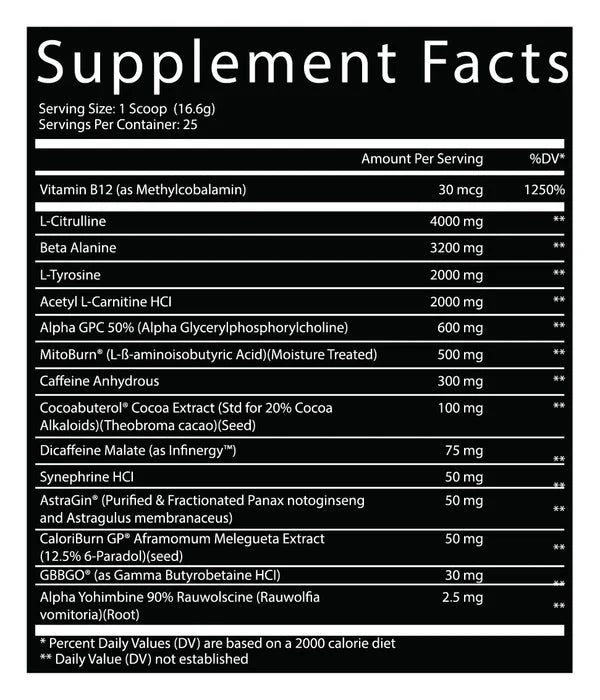 Fat-Burning Power: Thermogenic ingredients like Mitoburn, CaloriBurn®, and Alpha Yohimbine to torch fat.