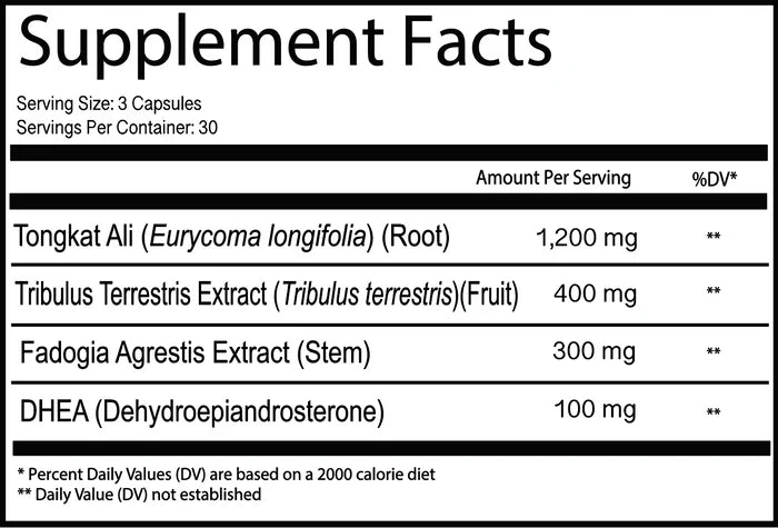 Tribulus (400 mg): Widely recognized for its strength-enhancing properties, Tribulus Terrestris aids in muscle growth, increases physical endurance, and supports libido. This ancient herb works harmoniously with Tongkat Ali to amplify your body’s performance capabilities.